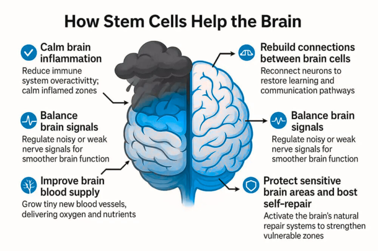 - It supports brain repair: By releasing growth factors, MSCs may help restore healthy connections between brain cells.